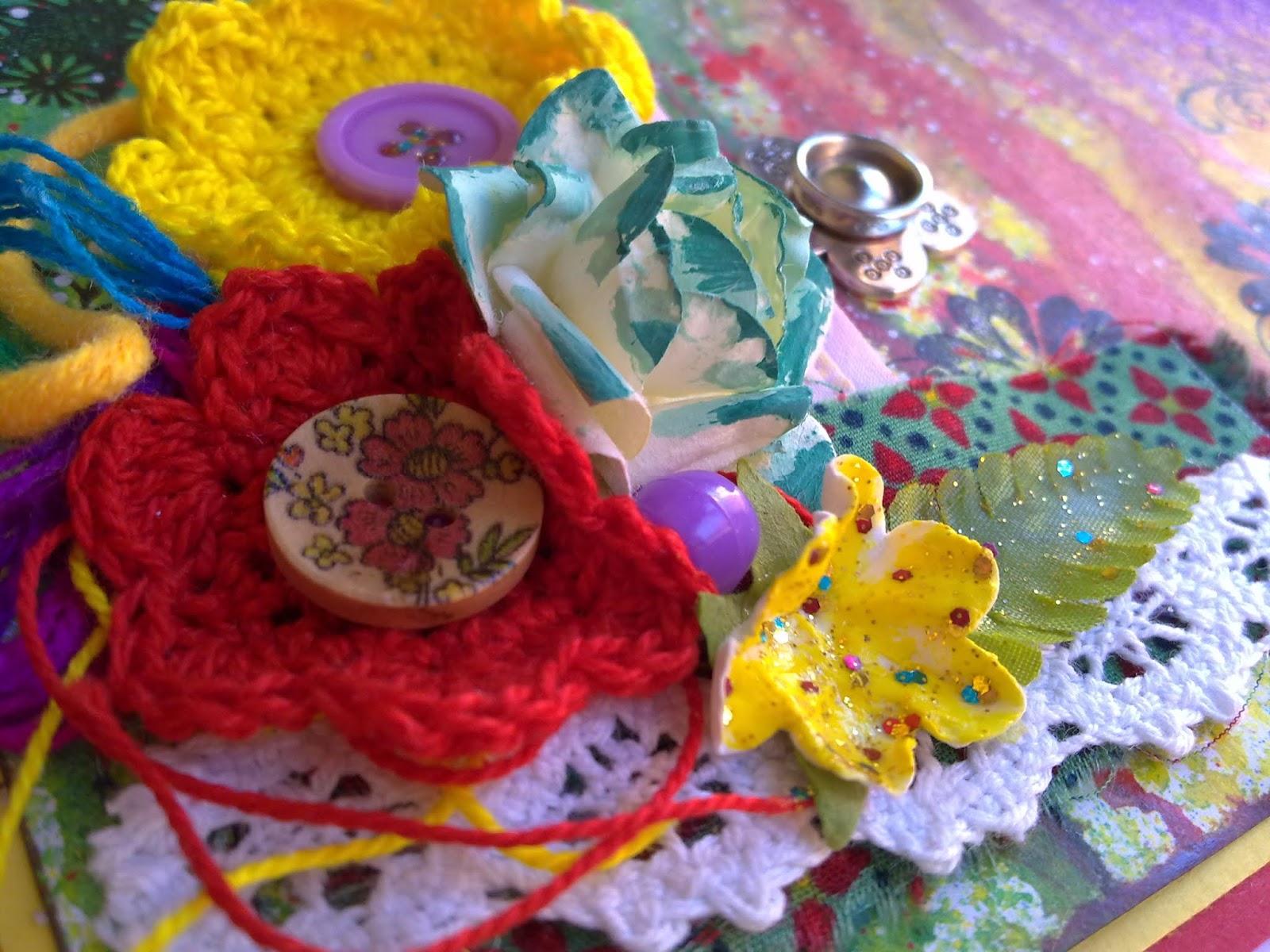 Me encanta esa combinación que has hecho de poner en un lado las flores de ganchillo con el resto de las texturas y por otro los sellos. Un trabajo muy bonito.